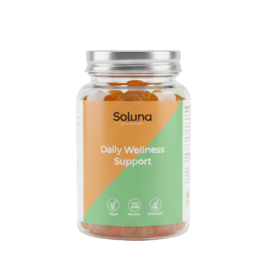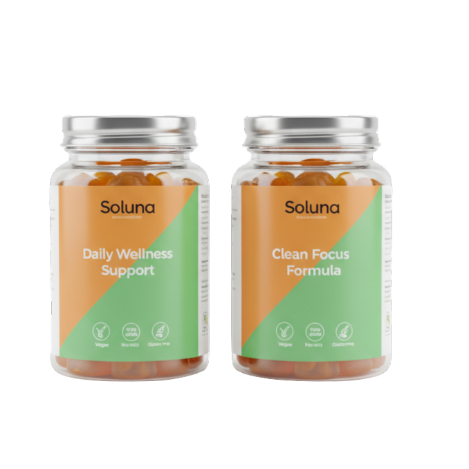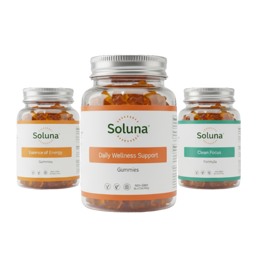 Instead of adding to the problem, we created a solution. Soluna blends the natural focus of green tea caffeine with the calming clarity of L-theanine and the essential support of B12. Every gummy is low-calorie, naturally sweetened, and consciously crafted to help you feel clear, energized, and in control.